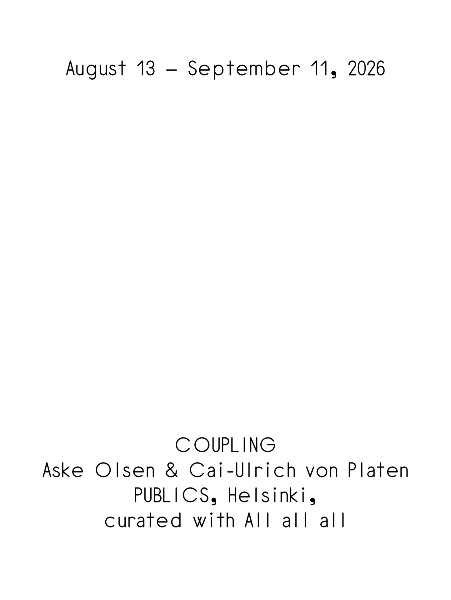 PUBLICS (Helsinki, founded 2017) explores an institutional model grounded in “working together” through overlapping collaborations. It approaches “the public” as plural—a concept, a community, and a spatio-temporal discourse. Within Scales, PUBLICS activates its coupling program by presenting Aske Olsen and Cai-Ulrich von Platen (both Denmark) in a joint exhibition. This approach shapes the broader exchange model and reflects the project’s cross-institutional ethos. The presentation is curated collaboratively by All all all and PUBLICS.