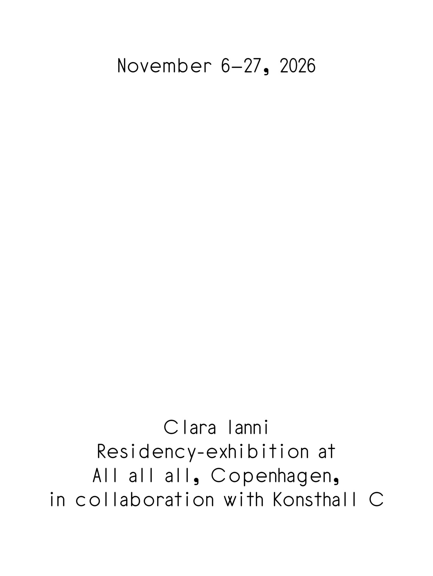 All all all (DK), Konsthall C (SE), Kunsthall Oslo (NO), and PUBLICS (FI) come together to present Scales, a rotating exhibition initiative connecting and exchanging programs across four Nordic art platforms. Scales is initiated by All all all and launches on May 1, 2026, and culminates in January 2027.